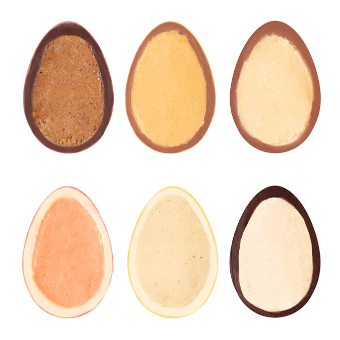 Die Osterüberraschung mit Pfiff: Sechs gefüllte bunte Schokoeier im Glas. In sechs verführerischen Sorten: Von Fruchtnougat über Karamell bis Mandel.